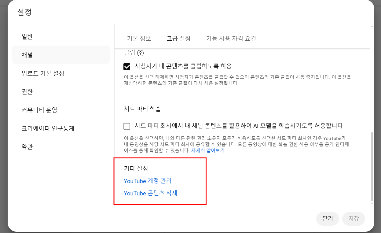 - 왼쪽 메뉴에서 설정 > 채널 > 고급 설정